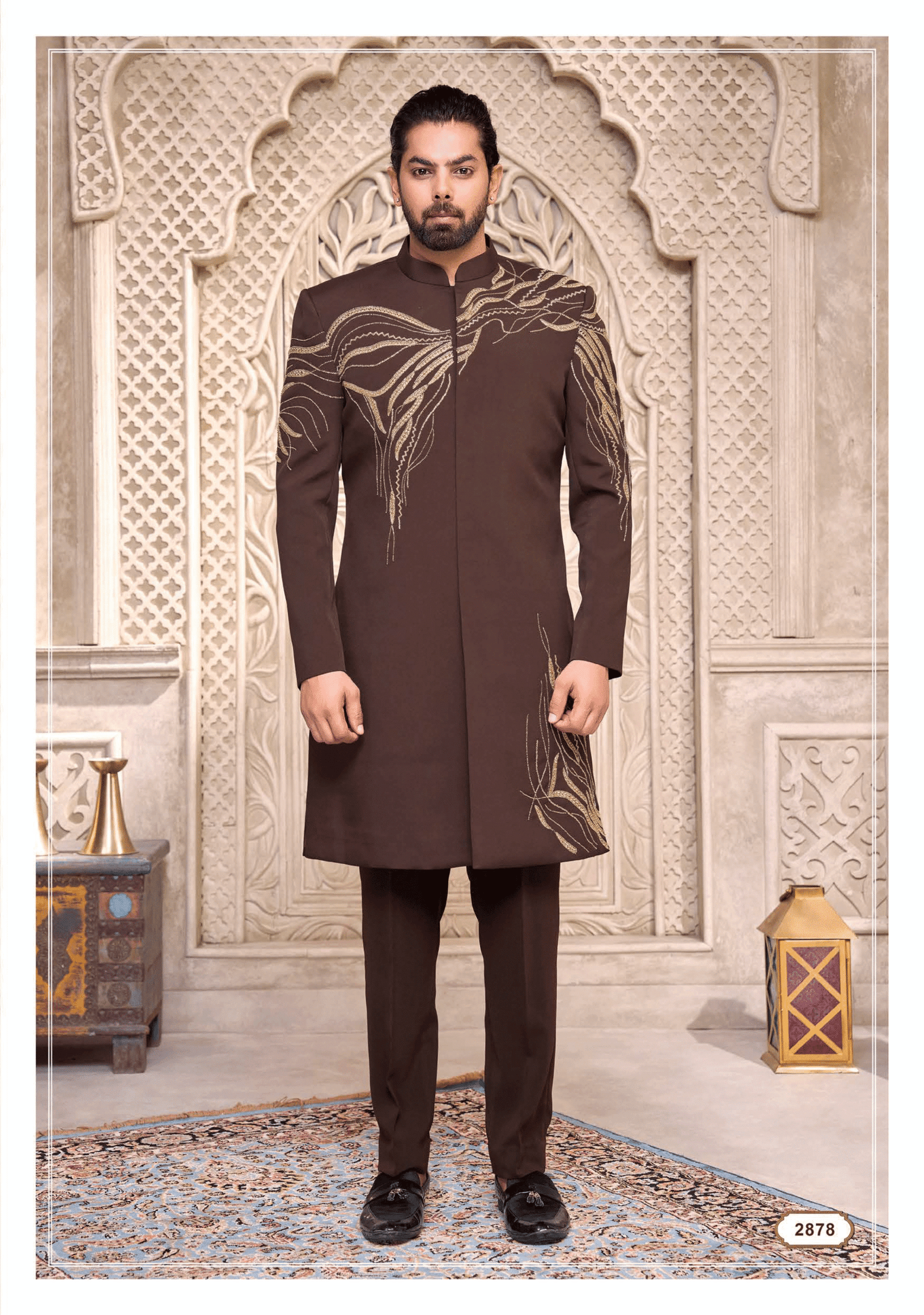 Make a statement of elegance with this Dark Brown Indo-Western Suit with Golden Embroidery – Regal Celebration Wear for Men. The deep brown shade enhanced with golden embroidery on the collar, front creates a majestic and luxurious appearance ideal for weddings, receptions, and grand celebrations.